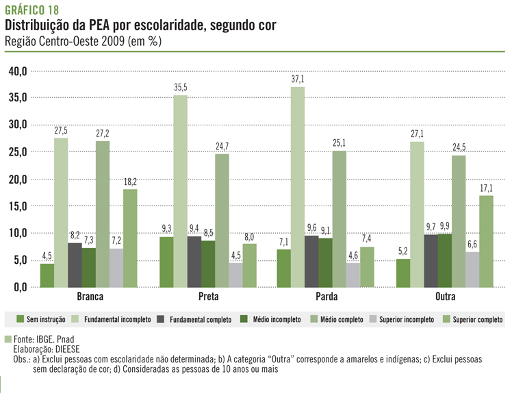 G18 Distribuição da PEA por escolaridade, segundo cor - Região Centro-Oeste
