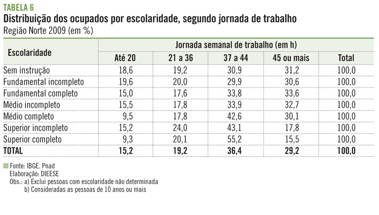 T6 Distribuição dos ocupados por escolaridade, segundo jornada de trabalho - Região Norte