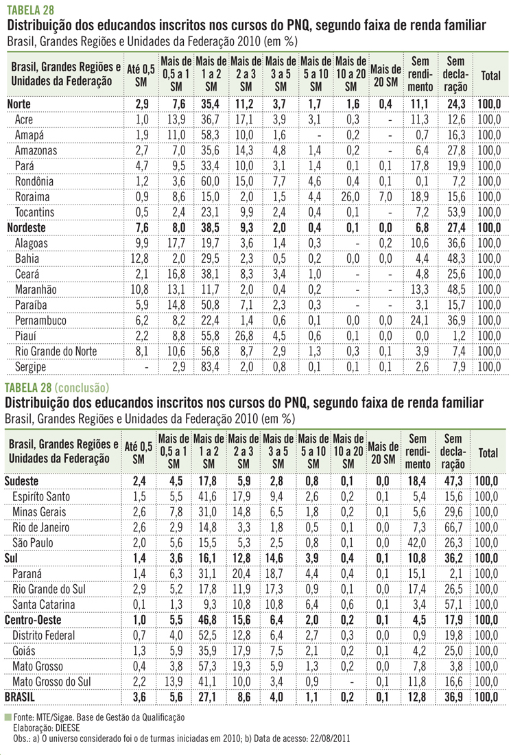 T28 Distribuição dos educandos inscritos nos cursos do PNQ, segundo faixa de renda familiar