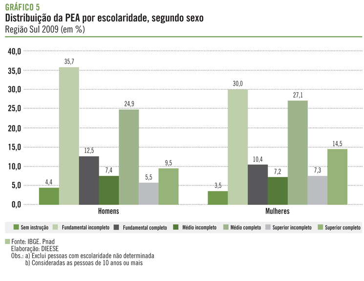 G5 Distribuição da PEA por escolaridade, segundo sexo - Região Sul