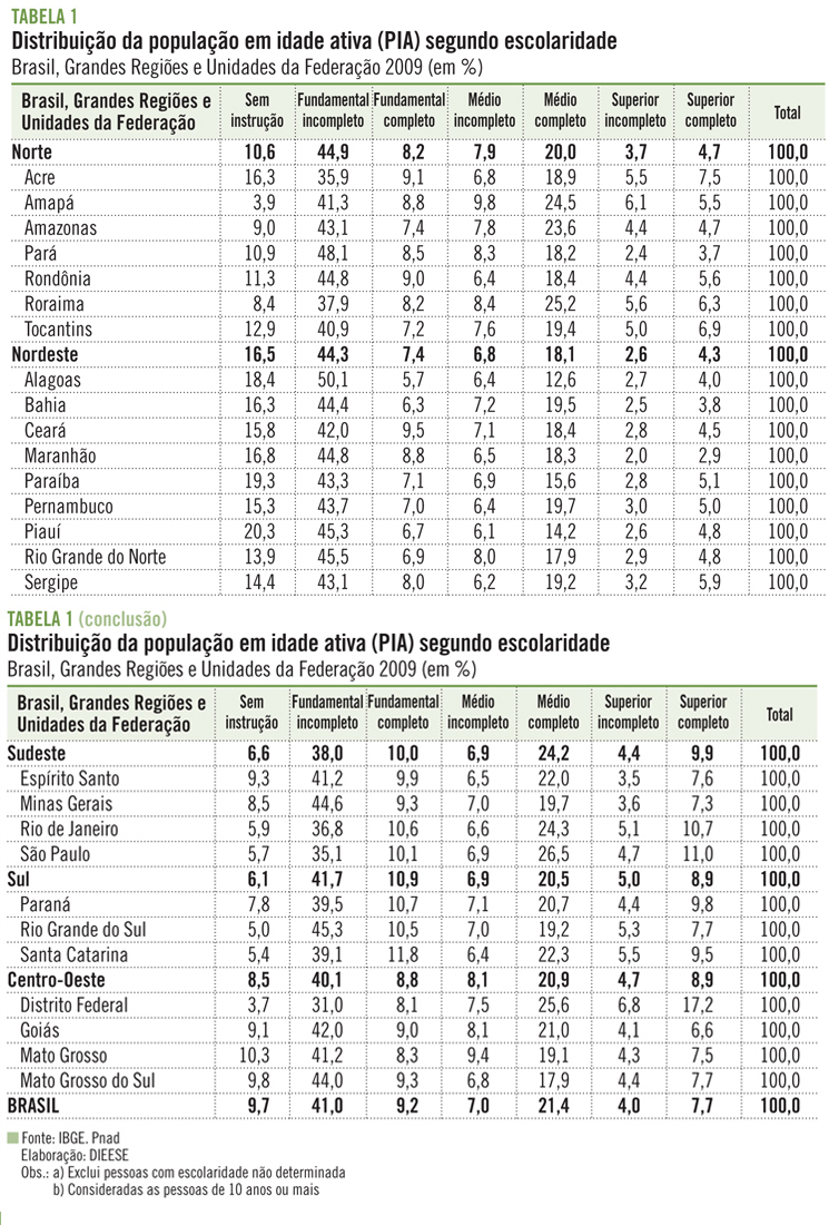 T1 Distribuição da população em idade ativa (PIA) segundo escolaridade