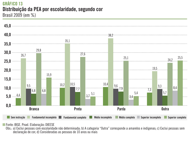 G13 Distribuição da PEA por escolaridade, segundo cor - Brasil