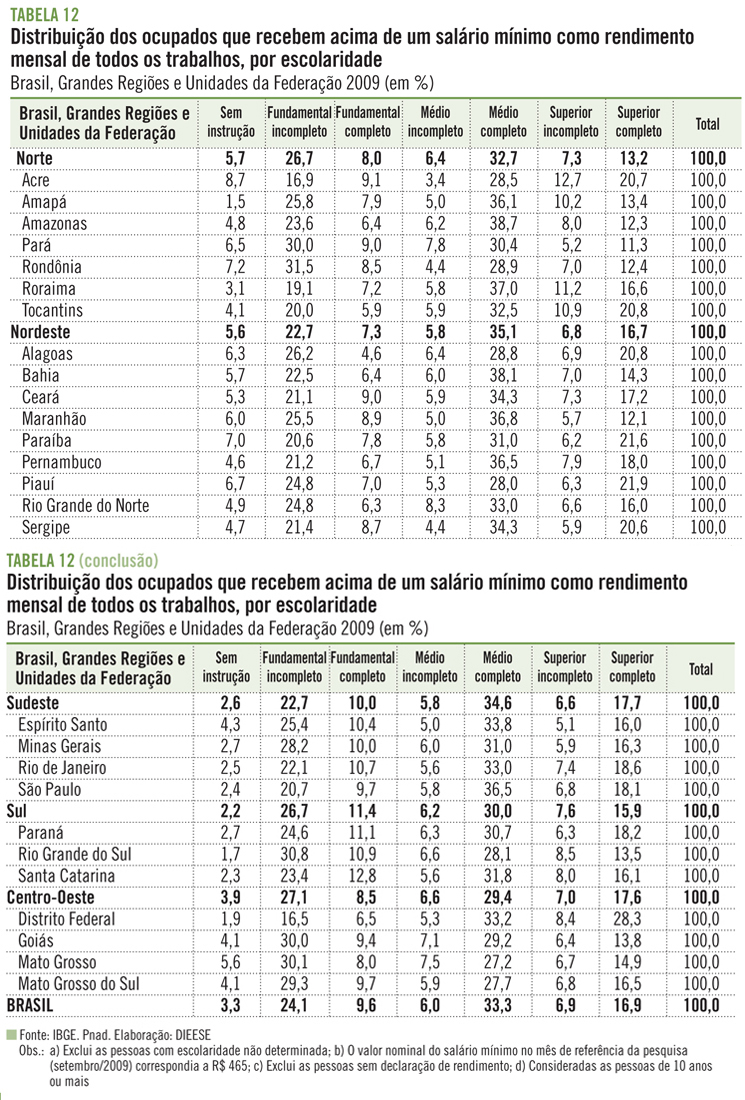 T12 Distribuição dos ocupados que recebem acima de um salário mínimo como rendimento mensal de todos os trabalhos, por escolaridade