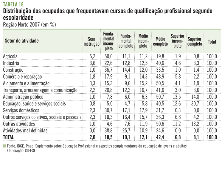 T18 Distribuição dos ocupados que frequentavam cursos de qualificação profissional segundo escolaridade - Região Norte