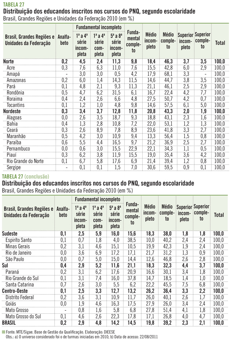 T27 Distribuição dos educandos inscritos nos cursos do PNQ, segundo escolaridade