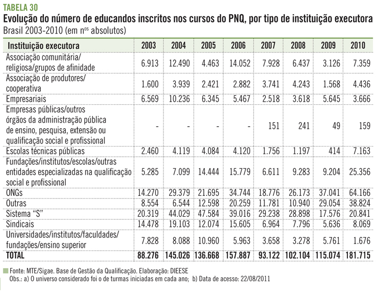 T30 Evolução do número de educandos inscritos nos cursos do PNQ, por tipo de instituição executora