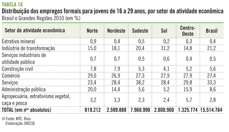 T18 Distribuição dos empregos formais para jovens de 16 a 29 anos, por setor de atividade econômica