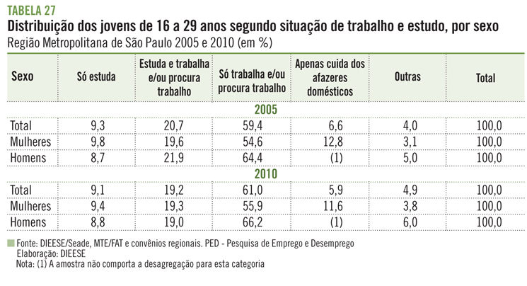 T27 Distribuição dos jovens de 16 a 29 anos segundo situação de trabalho e estudo, por sexo - Região Metropolitana de São Paulo