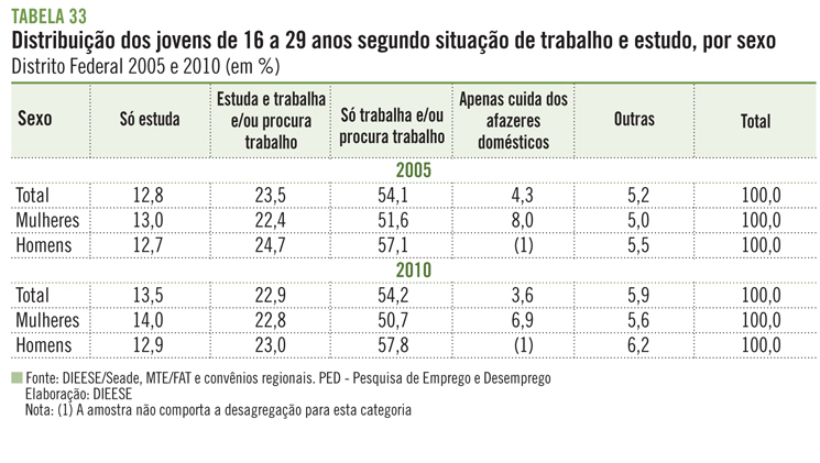 T33 Distribuição dos jovens de 16 a 29 anos segundo situação de trabalho e estudo, por sexo - Distrito Federal
