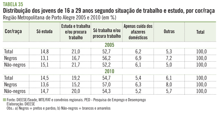 T35 Distribuição dos jovens de 16 a 29 anos segundo situação de trabalho e estudo, por cor/raça - Região Metropolitana de Porto Alegre