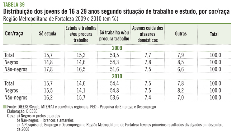 T39 Distribuição dos jovens de 16 a 29 anos segundo situação de trabalho e estudo, por cor/raça - Região Metropolitana de Fortaleza