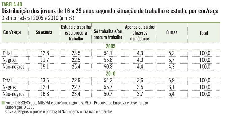 T40 Distribuição dos jovens de 16 a 29 anos segundo situação de trabalho e estudo, por cor/raça - Distrito Federal
