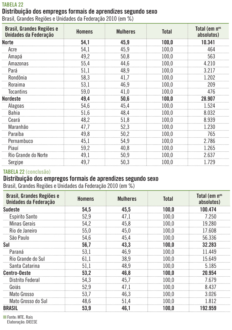 T22 Distribuição dos empregos formais de aprendizes segundo sexo