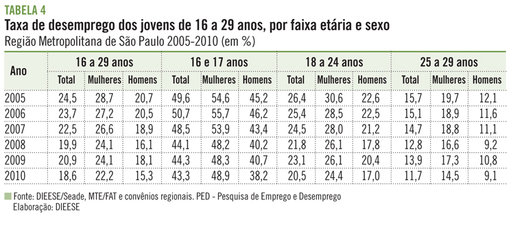T4 Taxa de desemprego dos jovens de 16 a 29 anos, por faixa etária e sexo - RM São Paulo