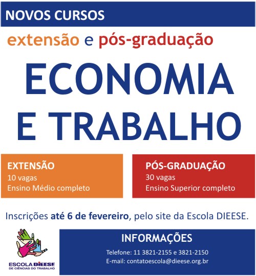 A Escola DIEESE de Ciências do Trabalho está com inscrições abertas, até 6 de fevereiro, para cursos de pós-graduação e de extensão em Economia e Trabalho. As aulas serão presenciais, em São Paulo, e terão início em março deste ano. Os cursos têm como objetivo o desenvolvimento de atividades que tenham como foco as diferentes dimensões das relações de trabalho.