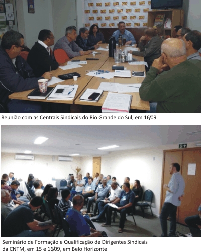 - Em 15 e 16/09, o supervisor técnico do Escritório Regional MG, Fernando Ferreira Duarte, e o técnico Anacleto dos Santos, da Subseção da Confederação Nacional dos Trabalhadores Metalúrgicos (CNTM-Força Sindical), falaram sobre Conjuntura do Ramo Metalúrgico, no Seminário de Formação e Qualificação de Dirigentes Sindicais da CNTM. A atividade foi realizada em Belo Horizonte.