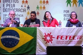 - De 7 a 9 de julho, as técnicas Catia Uehara, da Subseção do Sindicato dos Bancários e Financiários de São Paulo, Osasco e Região, e Regina Camargos, da Subseção da Confederação Nacional dos Trabalhadores do Ramo Financeiro (Contraf-CUT), participaram da 19ª Conferência Estadual dos Bancários do Paraná, em Curitiba. No evento, elas falaram sobre reforma trabalhista e reestruturação dos bancos e emprego bancário (foto).