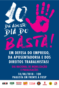 As Centrais Sindicais organizam para o próximo 10/08 o Dia do Basta, uma data nacional para mobilização e paralisações de várias categorias. As atividades serão um momento em que os trabalhadores poderão mostrar, conjuntamente, a insatisfação contra o desemprego, a queda na renda, a retirada e o rebaixamento de direitos, com a reforma trabalhista e a terceirização irrestrita, a proposta de reforma da previdência e outros temas. Os protestos reivindicarão a retomada do crescimento, com desenvolvimento e inclusão social.
